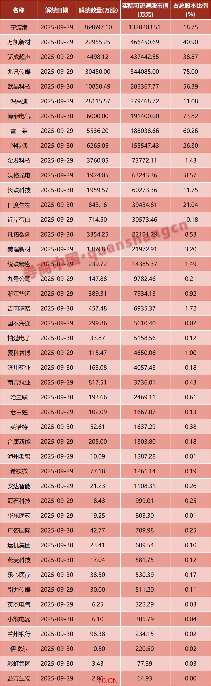 数据显示,本周(9月29日—10月3日)共有45家公司限售股陆续解禁,合计解禁49.69亿股,按最新收盘价计算,解禁总市值为405.83亿元。