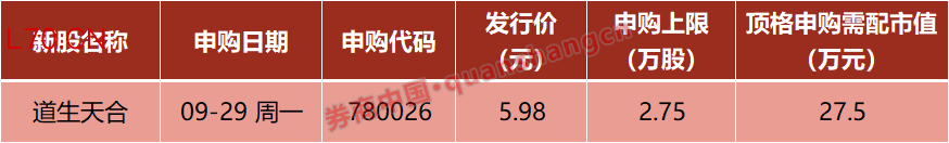 配资网站本周(9月29日—10月3日)有1只新股发行。周一:道生天合。