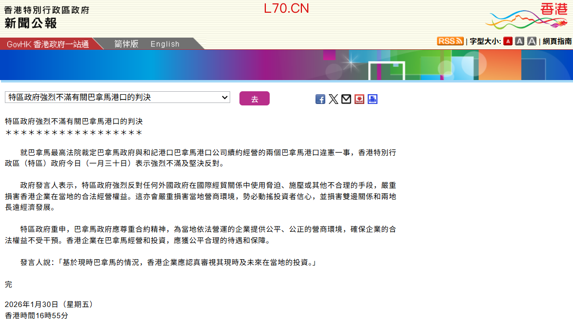 香港回应巴拿马涉港口有关裁决:坚决反对 港企应认真审视当地投资