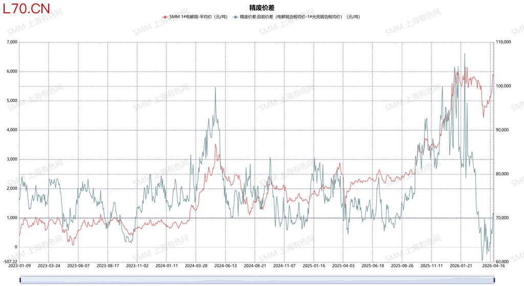 持货商方面,销售情绪指数持续攀升至高位,反映出其对后市依然乐观,普遍认为铜价仍有上行空间,因此并不急于在当前价位大量出货,反而选择囤货惜售,等待价格进一步冲高。这种强烈的惜售心态,叠加下游企业在高价位下的采购意愿不足,使得市场实际流通货源并未因价格高涨而显著放量,供需双方陷入新一轮的僵持与观望。从价差结构看,精废杆价差随铜价上涨而同步走扩,至周末维持在1710元/吨的较高水平,这为再生铜杆消费提供了一定的经济性空间。但精废价差(电解铜与再生铜原料价差)的修复相对滞后,反映出含税再生铜原料价格因票点成本支撑而调整缓慢,继续对下游企业的利润空间构成挤压。