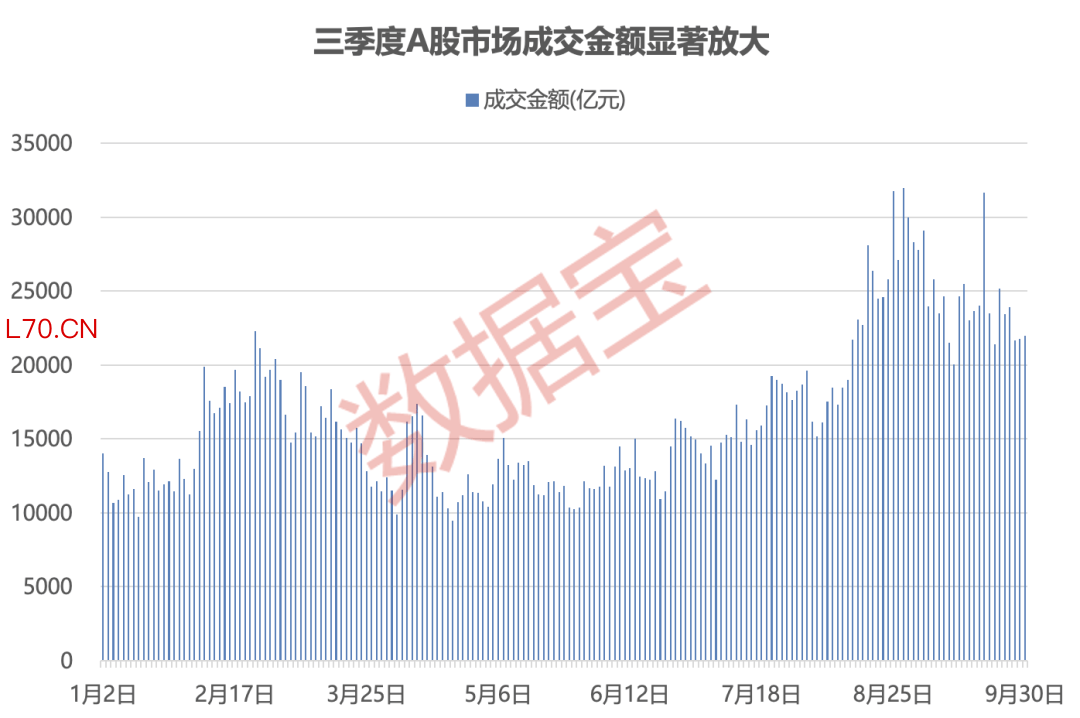 行情向好的原因是市场交易量的大幅活跃。三季度以来,A股市场成交额明显放大,8月13日至今连续35个交易日成交金额超过2万亿元。数据显示,第三季度单日平均成交金额为21085.88亿元,远高于上半年日均的13882.38亿元。