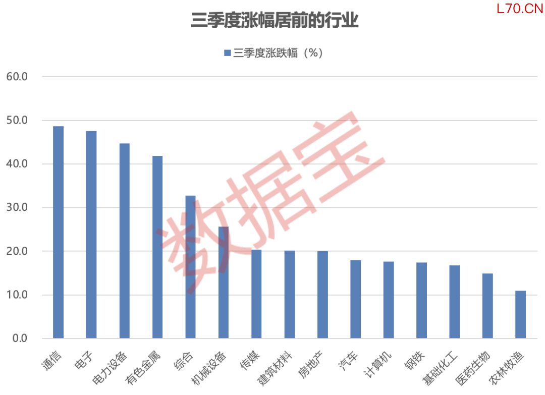 31个申万行业指数中,15个行业指数三季度涨幅超过10%,占比过半。TMT相关行业表现亮眼,通信、电子、电力设备、有色金属4个行业涨幅居前,均超过40%。