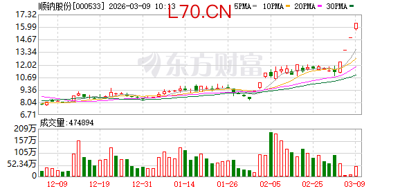 顺钠股份盘中涨停,已连收4个涨停板,截至9:31,该股报16.37元,换手率6.16%,成交量4216.51万股,成交金额6.75亿元,涨停板封单金额为3.85亿元。连续涨停期间,该股累计上涨46.42%,累计换手率为17.17%。最新A股总市值达113.09亿元,A股流通市值112.12亿元。