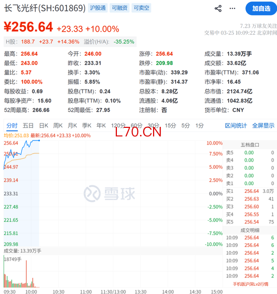 光纤概念股持续拉升,长飞光纤走出2连板。