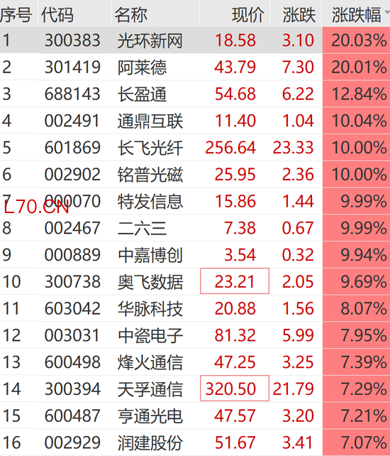 个股方面,铭普光磁竞价涨停,阿莱德20cm涨停,通鼎互联、中嘉博创、二六三、特发信息(维权)等纷纷涨停。
