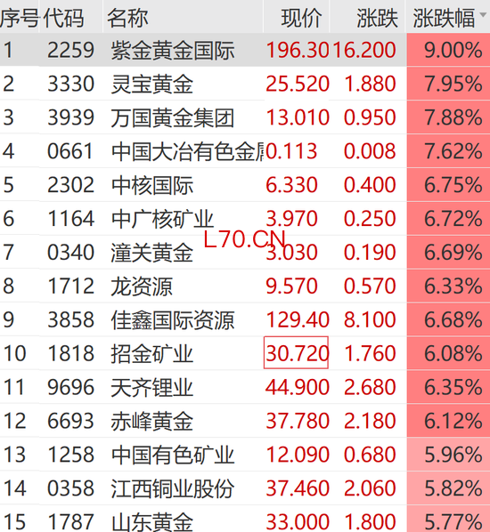 港股贵金属板块同步走强,紫金黄金国际大涨9%,灵宝黄金、万国黄金集团、赤峰黄金、山东黄金等跟涨。