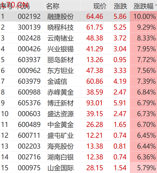 个股方面,融捷股份涨停,晓程科技、兴业银锡、赤峰黄金、盛达资源、中金黄金等纷纷大涨。