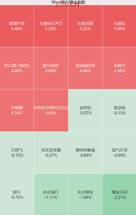 盘面上,有色金属、通信、电子、计算机等板块走强,光模块、光通信、算力租赁、高速铜连接等概念股活跃;煤炭、石油石化、银行等板块走弱。