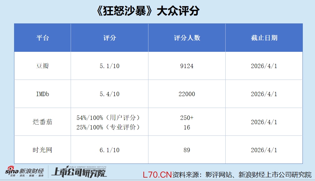 2025年10月,《狂怒沙暴》官方微博宣布影片定档同年12月上映,然而时至今日,该片仍未登陆内地大银幕。频繁跳票背后,该片在全球范围内收获了一致差评,IMDb评分5.4,豆瓣评分5.1,而烂番茄上仅有约25%的专业影评人给出了正面评价。即便未来能成功在内地上映,其票房表现恐怕也不太乐观。