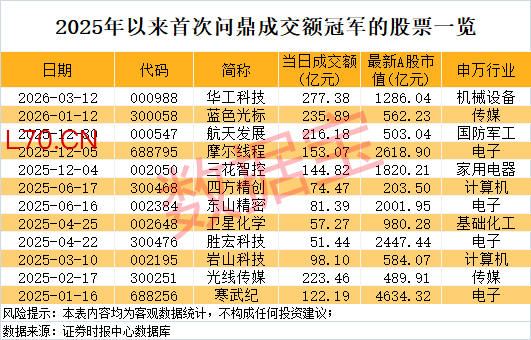 证券时报·数据宝统计,截至3月12日收盘,2025年以来,共有12股首次登顶A股成交额冠军宝座,包括卫星化学、胜宏科技(300476)、岩山科技、光线传媒(300251)、寒武纪等。华工科技今日凭借277.38亿元的成交额首次问鼎。