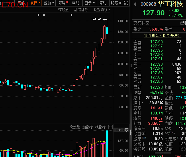 3月12日,华工科技(000988)(000988)股价大幅波动,盘中一度涨超4%,最高触及141.41元/股,创下历史新高炒股每天看盘多久,收盘时股价下跌5.17%。截至收盘,该股全天成交明显放量,成交额高达277.38亿元,为该股首次夺得A股单日成交额冠军。