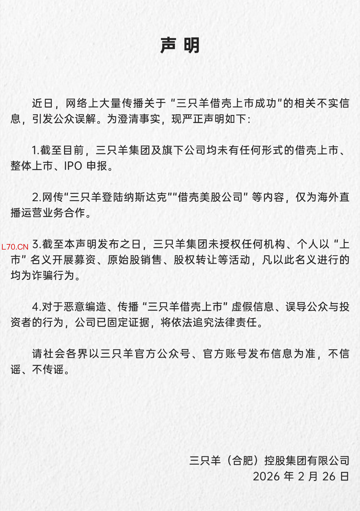 三只羊网络回应网传“借壳上市成功”:为不实信息