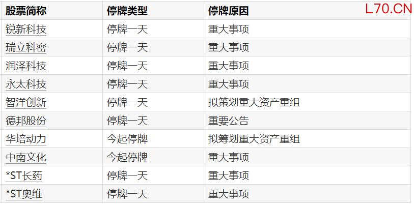 A股停牌提示:10股今日停牌