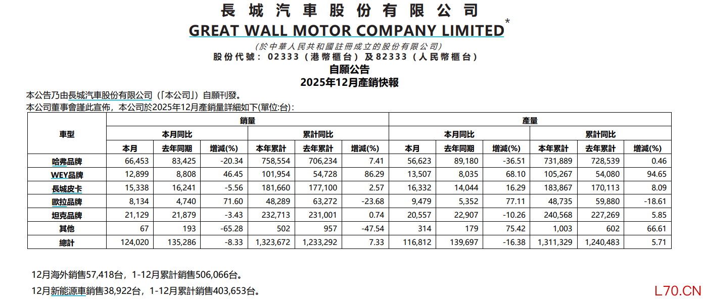 长城汽车:2025年汽车销量为132.4万辆,同比增长7.33%