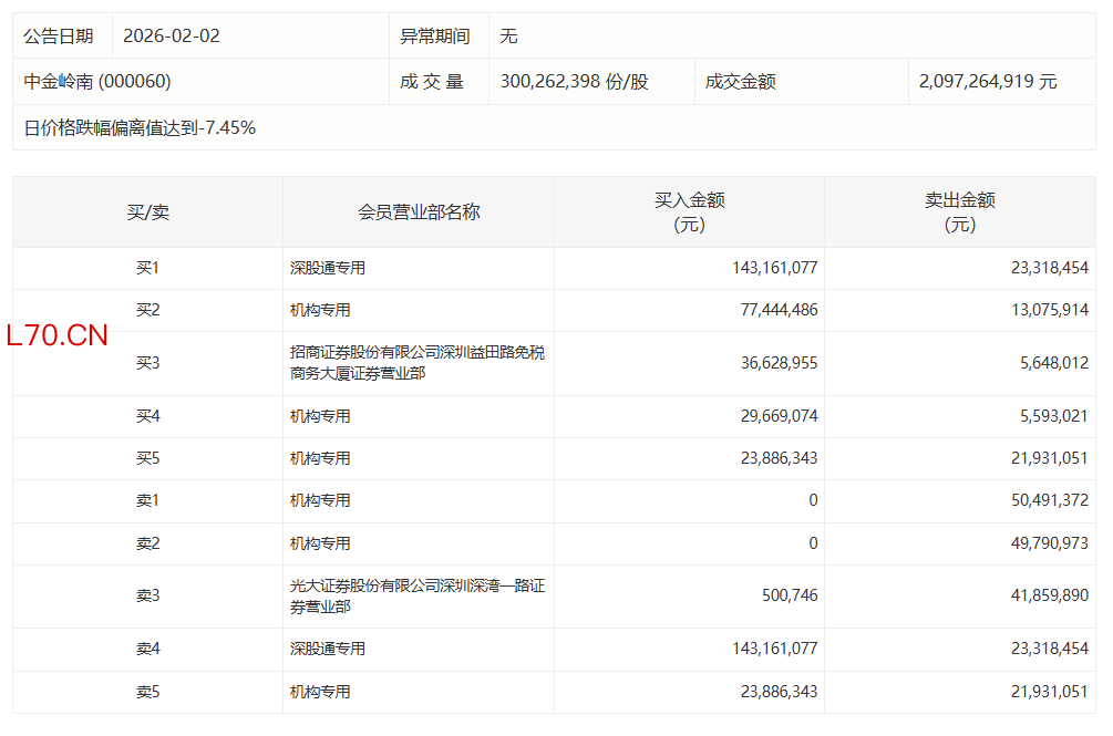 中金岭南今日跌停,有2家机构专用席位净卖出1亿元