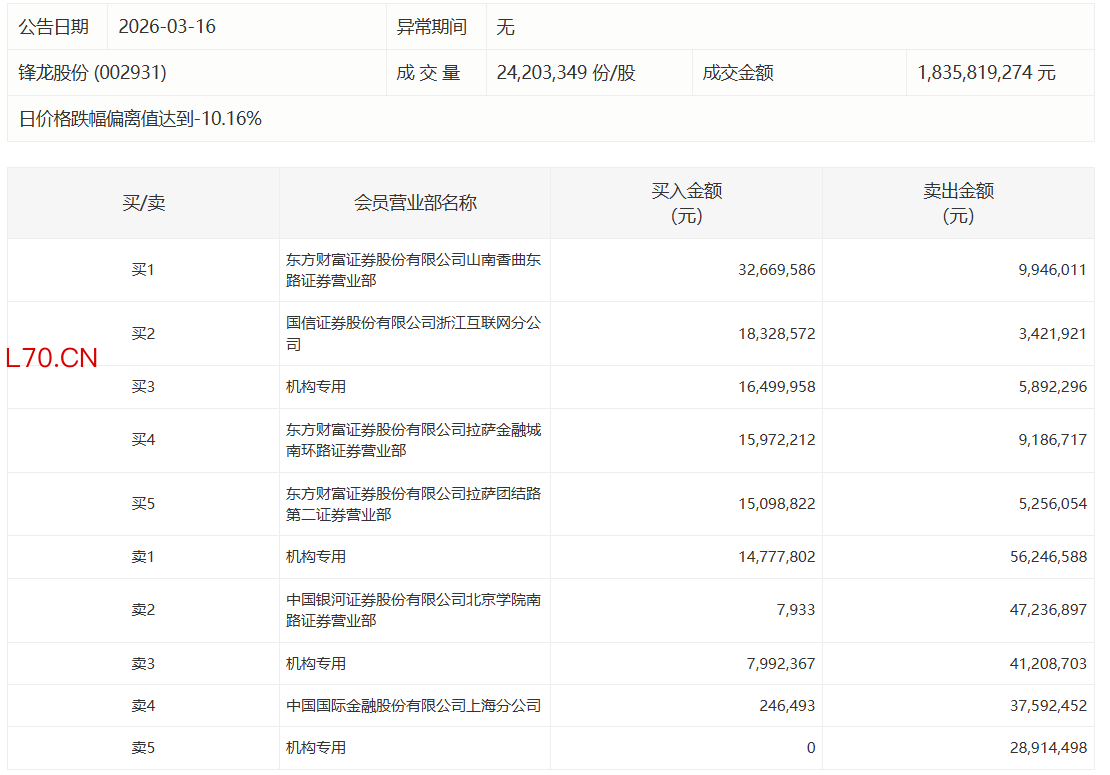 锋龙股份今日跌停,有3家机构专用席位净卖出1.04亿元