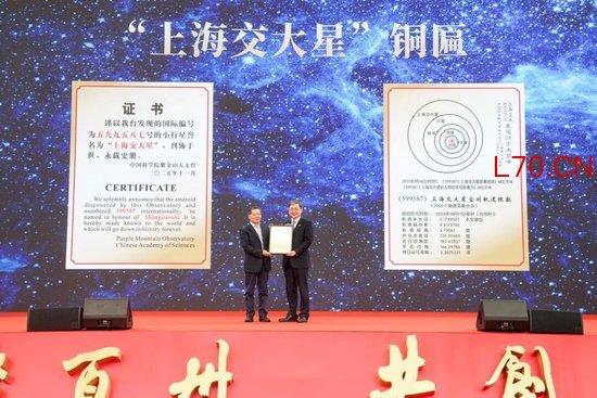 在上海交通大学建校130周年之际,上海交通大学科学家携手紫金山天文台,申请将编号为599587的小行星命名为“上海交大星”。中国科学院院士景益鹏宣读“上海交大星”国际命名公报。丁奎岭代表学校接受紫金山天文台台长赵长印赠送的“上海交大星”铜匾。全球交大人将循着星光的指引,在探索真理的道路上不断前行,让交大精神在更广阔的宇宙中熠熠生辉。