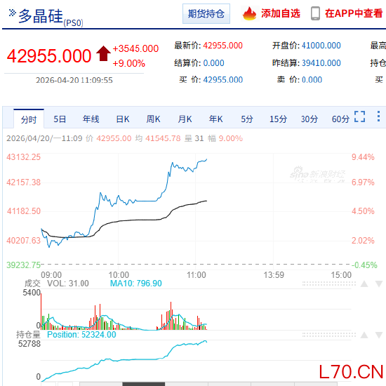 快讯:多晶硅主力合约触及涨停,现报42955元/吨